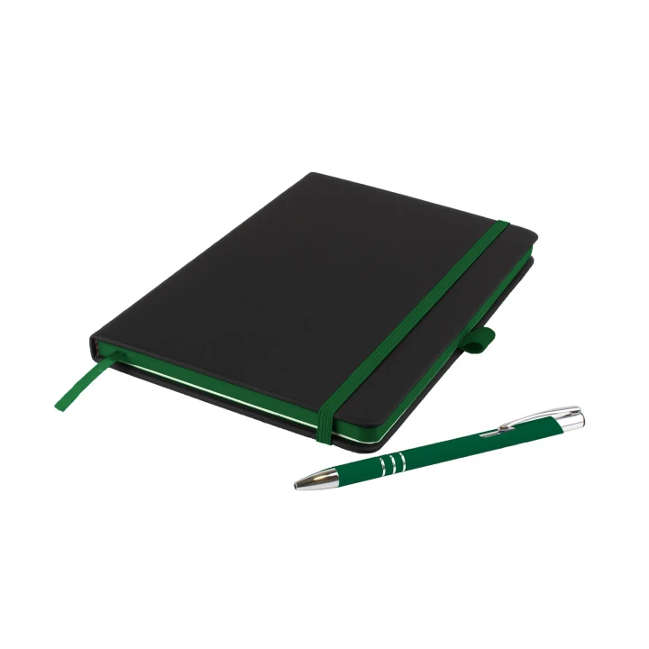 Distinctive A5 hardback notebook features a soft black PU cover. Complete with colour matched DaVinci ballpen and contrasting coloured page edges, ribbon, pen loop, elastic closure, 192 Ivory pages, date marks, and a back cover pocket.
