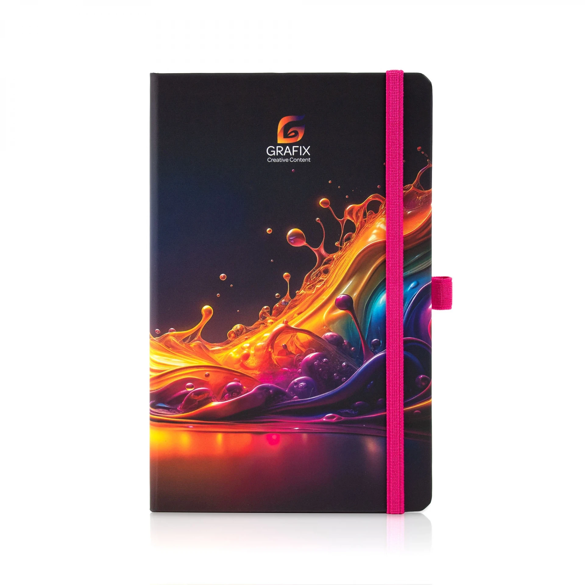 A modular notebook designed for the ultimate customisation with three sizes and seven interchangeable components to choose from: full colour (CMKY) printed cover with soft-feel lamination, five inner page blocks, 22 ribbon colours, 18 elastic closure colours, 18 pen loop colour, and 11 end papers and pocket colours. Plus a range of branding and optional extras.
