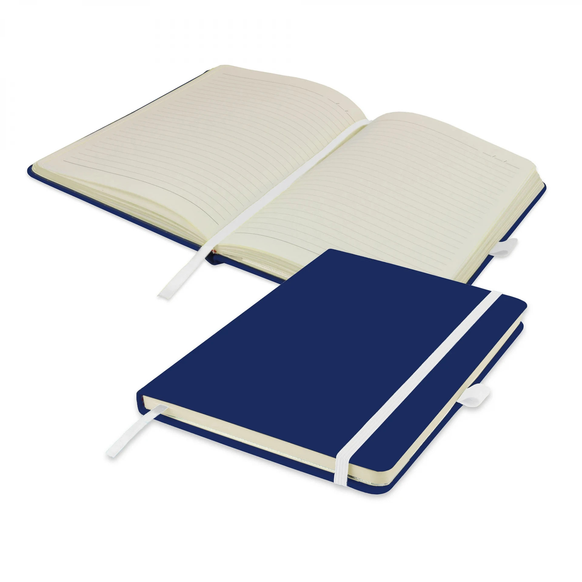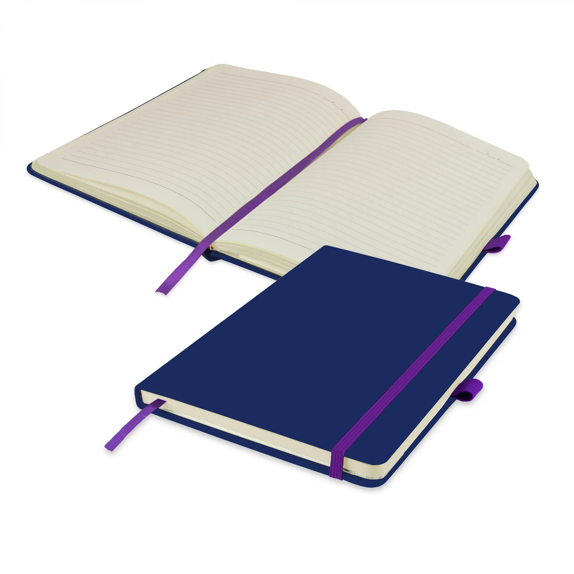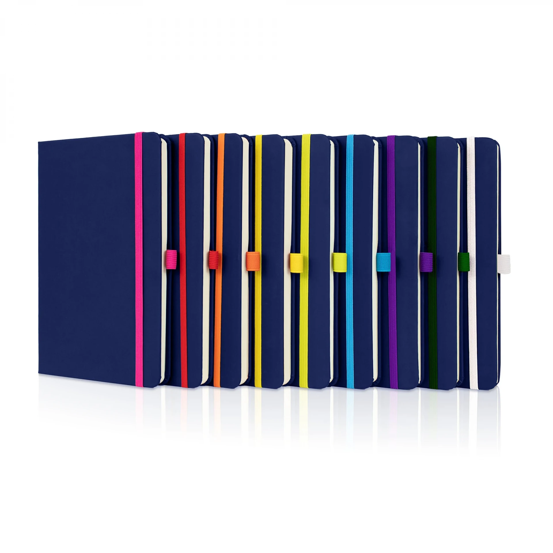 Introducing a rich navy blue hardback A5 notebook with a thick soft-feel PU cover complete with colour contrasting ribbon, pen loop and elastic closure. Featuring 192 Ivory lined pages with date marks and an inside back cover pocket.