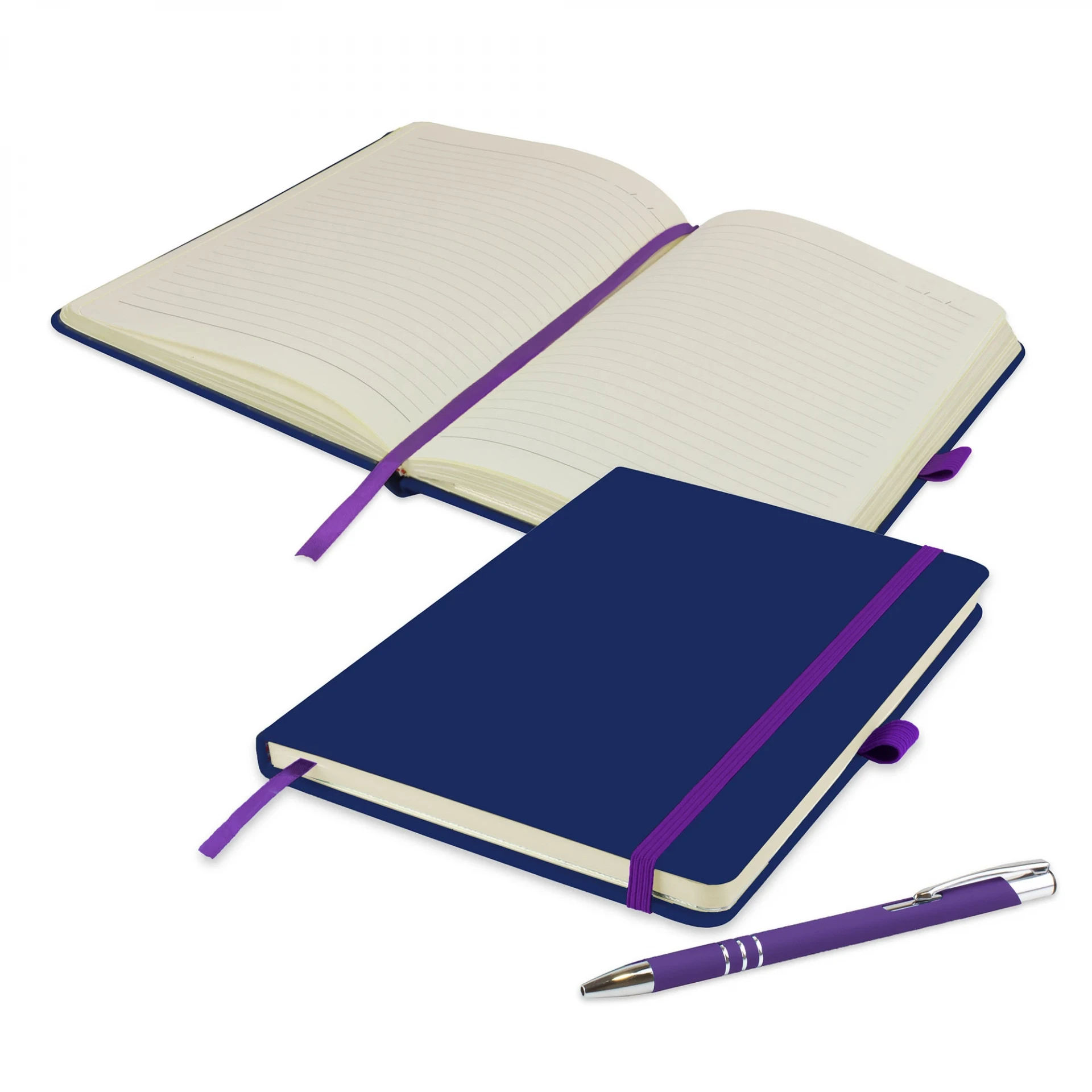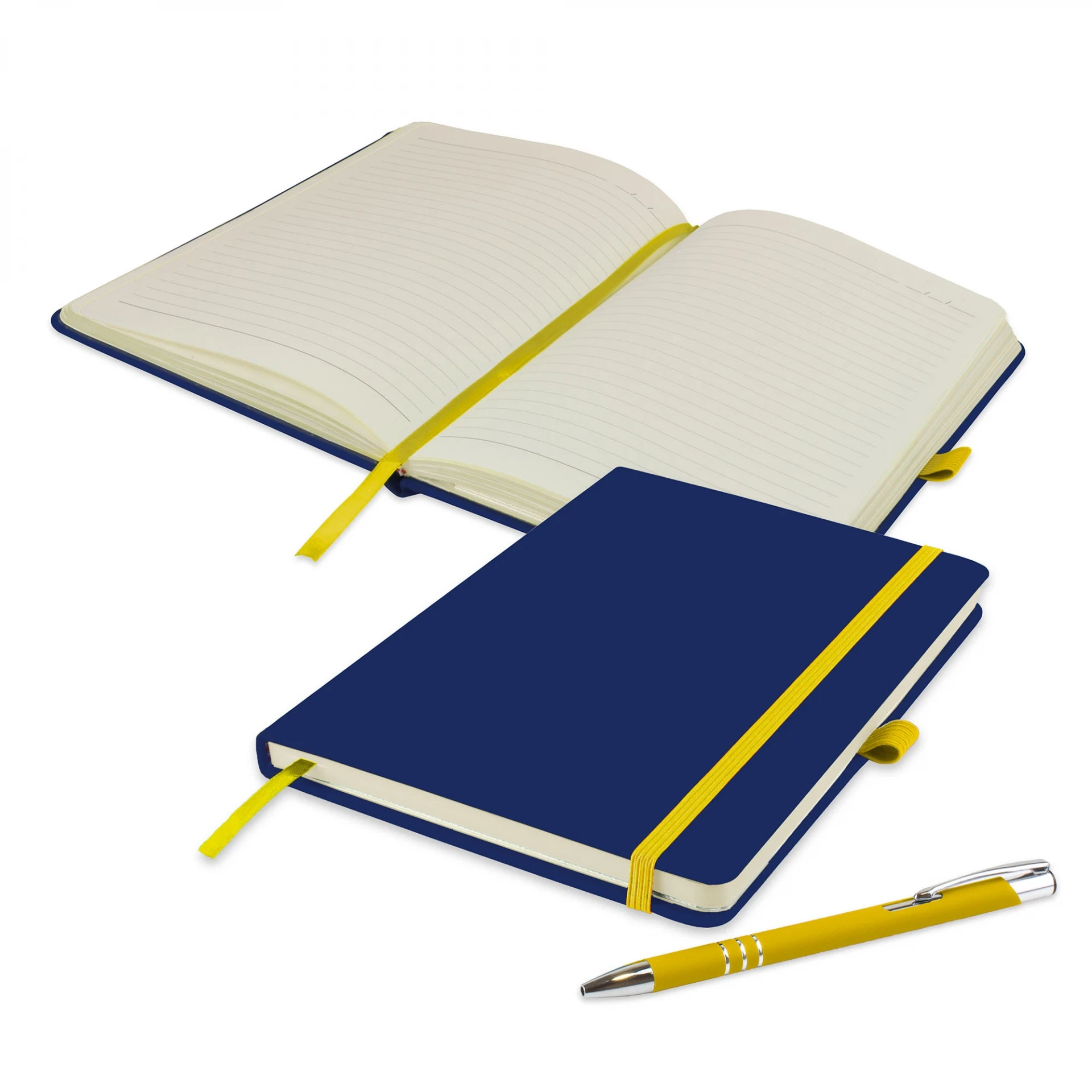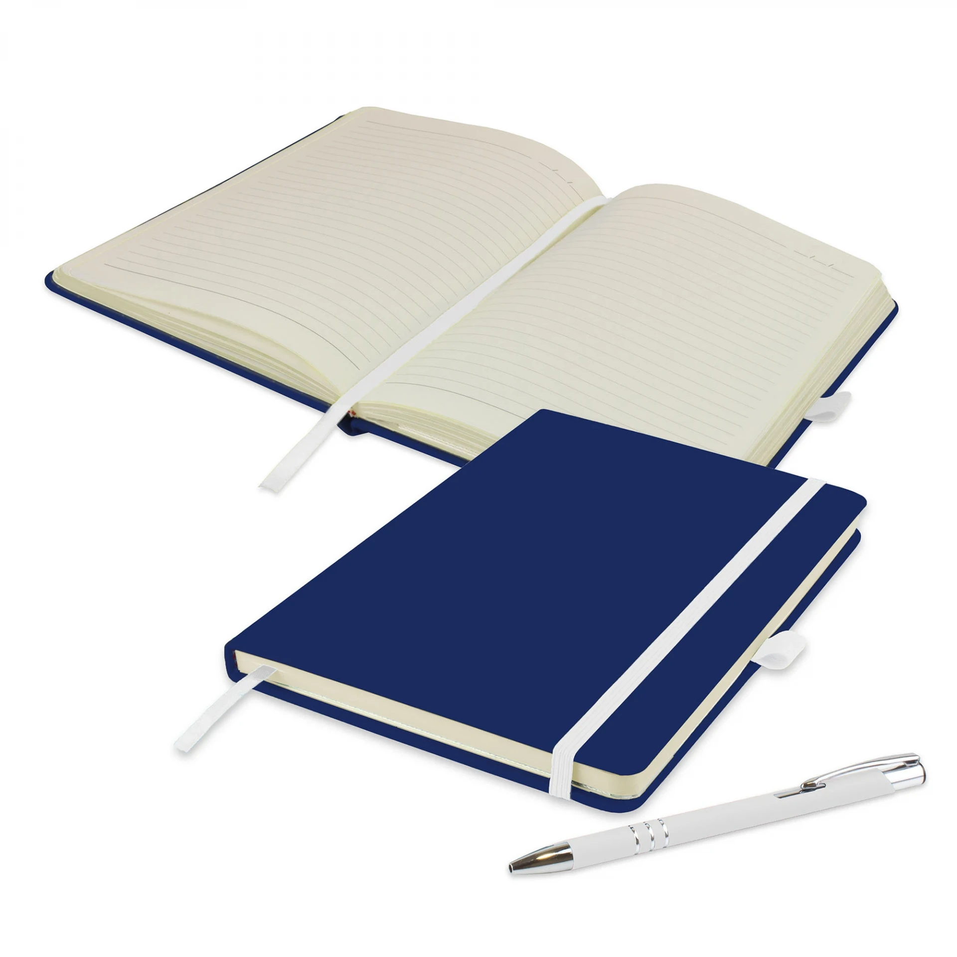 Introducing a rich navy blue hardback A5 notebook with a thick soft-feel PU cover complete with colour matching DaVinci ballpoint pen, ribbon, pen loop and elastic closure. Featuring 192 Ivory lined pages with date marks and an inside back cover pocket.