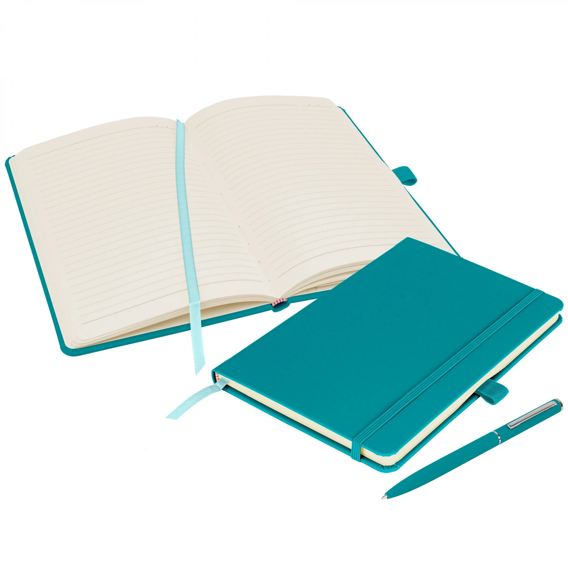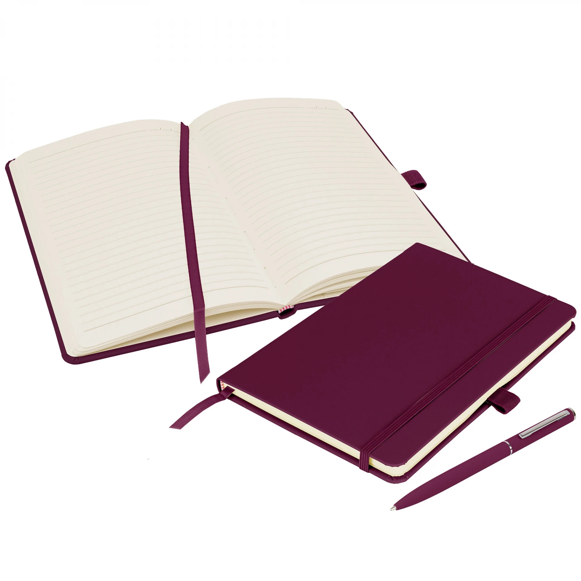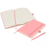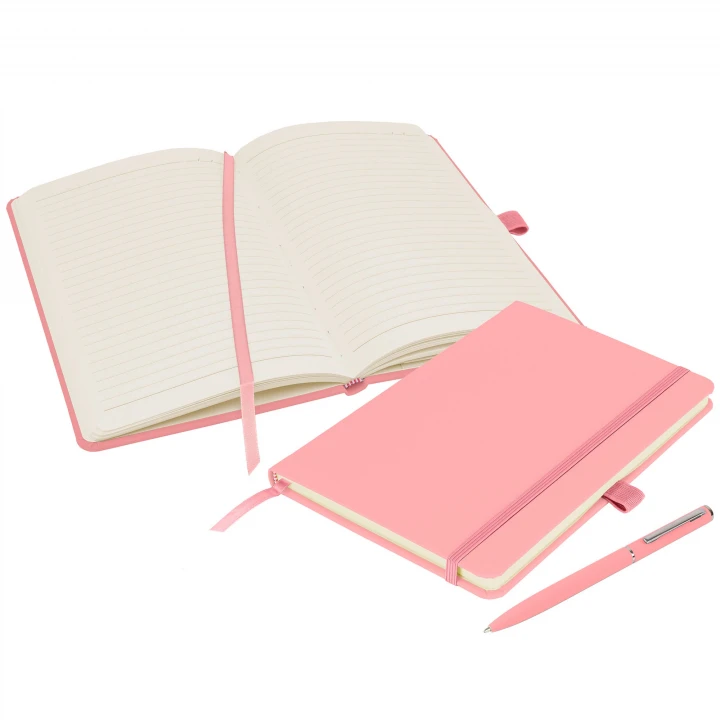 Deluxe eco-friendly A5 notebook offering high quality with its hardback, soft-feel PU cover and matching Wright ballpen in 26 colours. Supplied with a colour matched ribbon, pen loop and elastic closure. Contains 160 pages of 70gsm Ivory lined, sustainably-sourced FSC certified paper, with date marks and an inside back cover pocket.