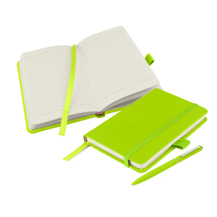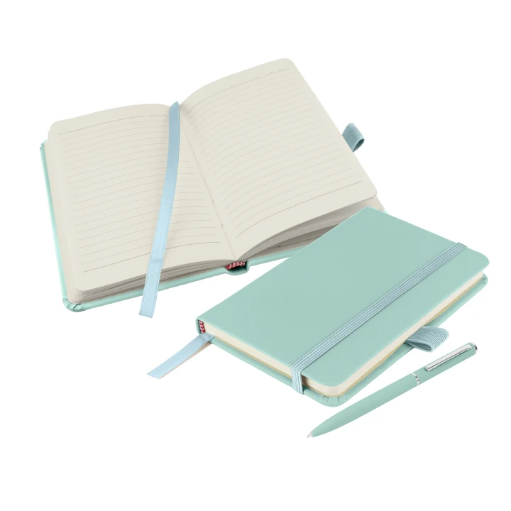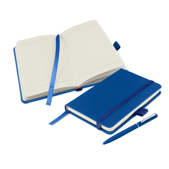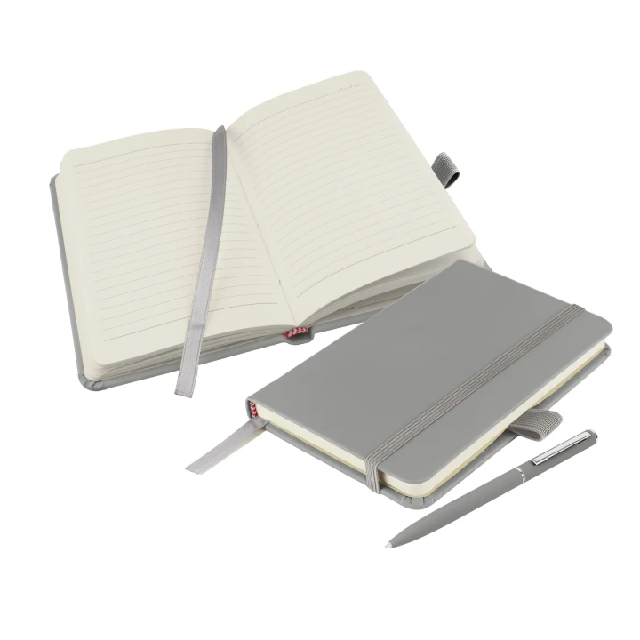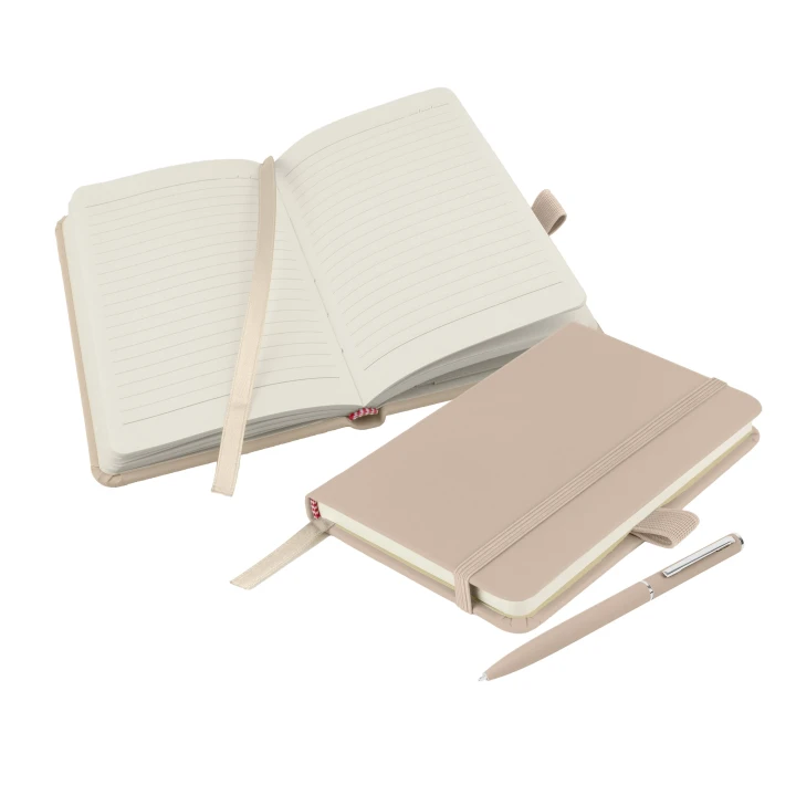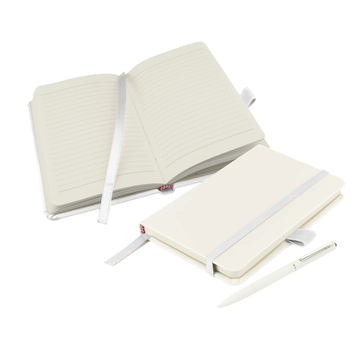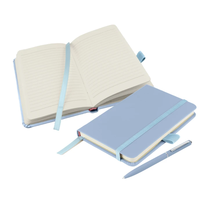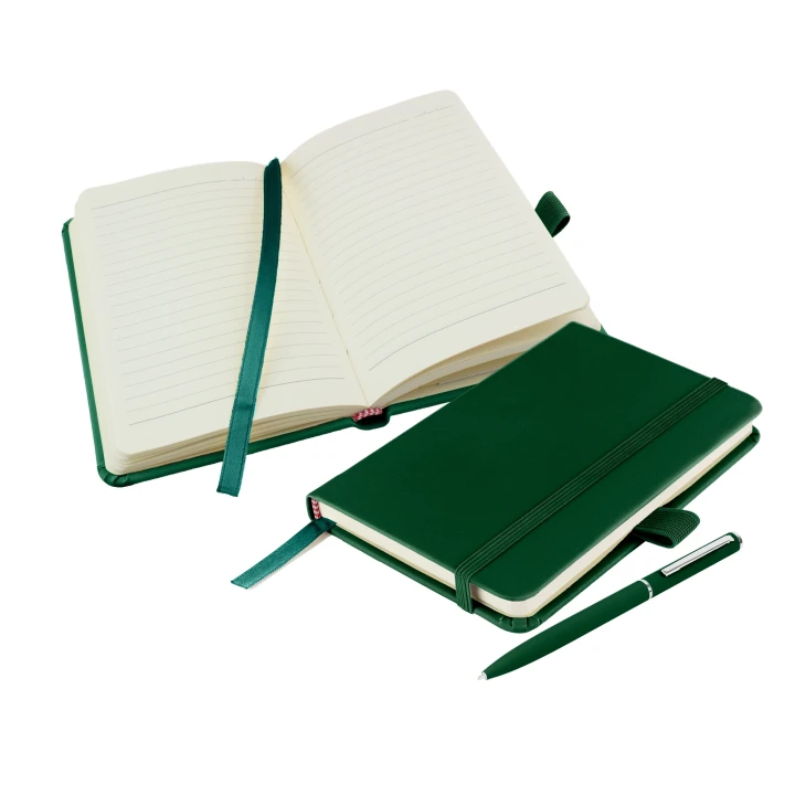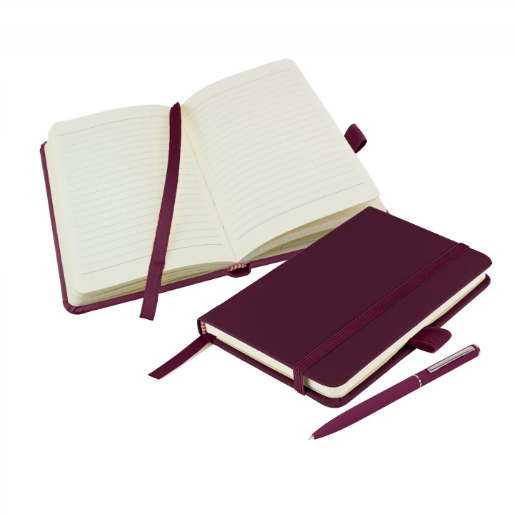 Deluxe eco-friendly A6 notebook offering high quality with its hardback, soft touch PU cover and matching Wright ballpen in 26 colours. Supplied with a colour matched ribbon, pen-loop and elastic closure. Contains 160 pages of Ivory lined paper, with date marks on each page and an inside back cover pocket, manufactured from FSC certified paper.