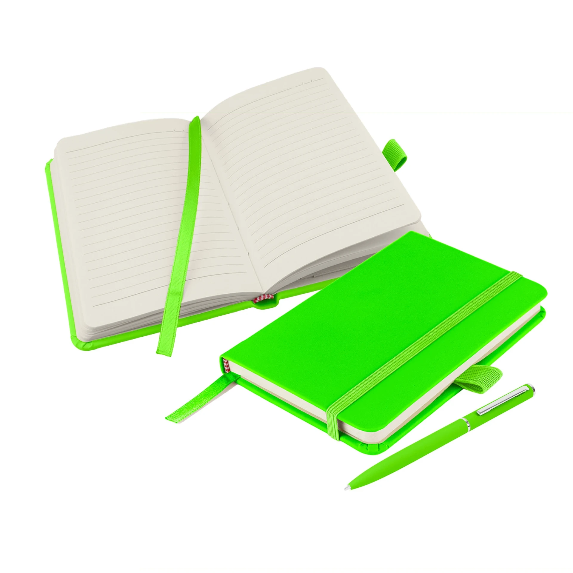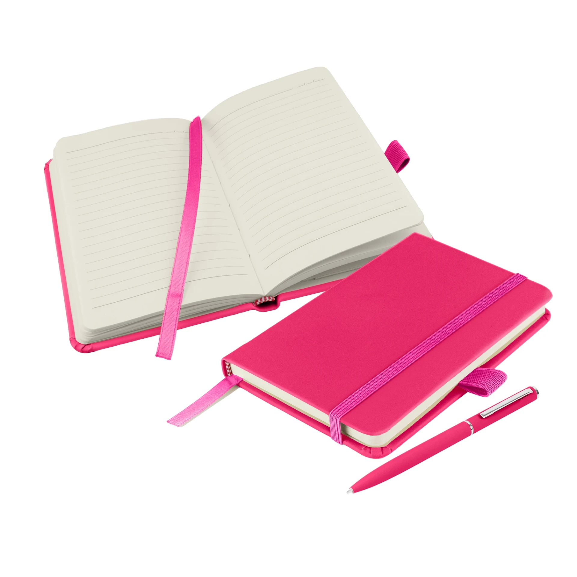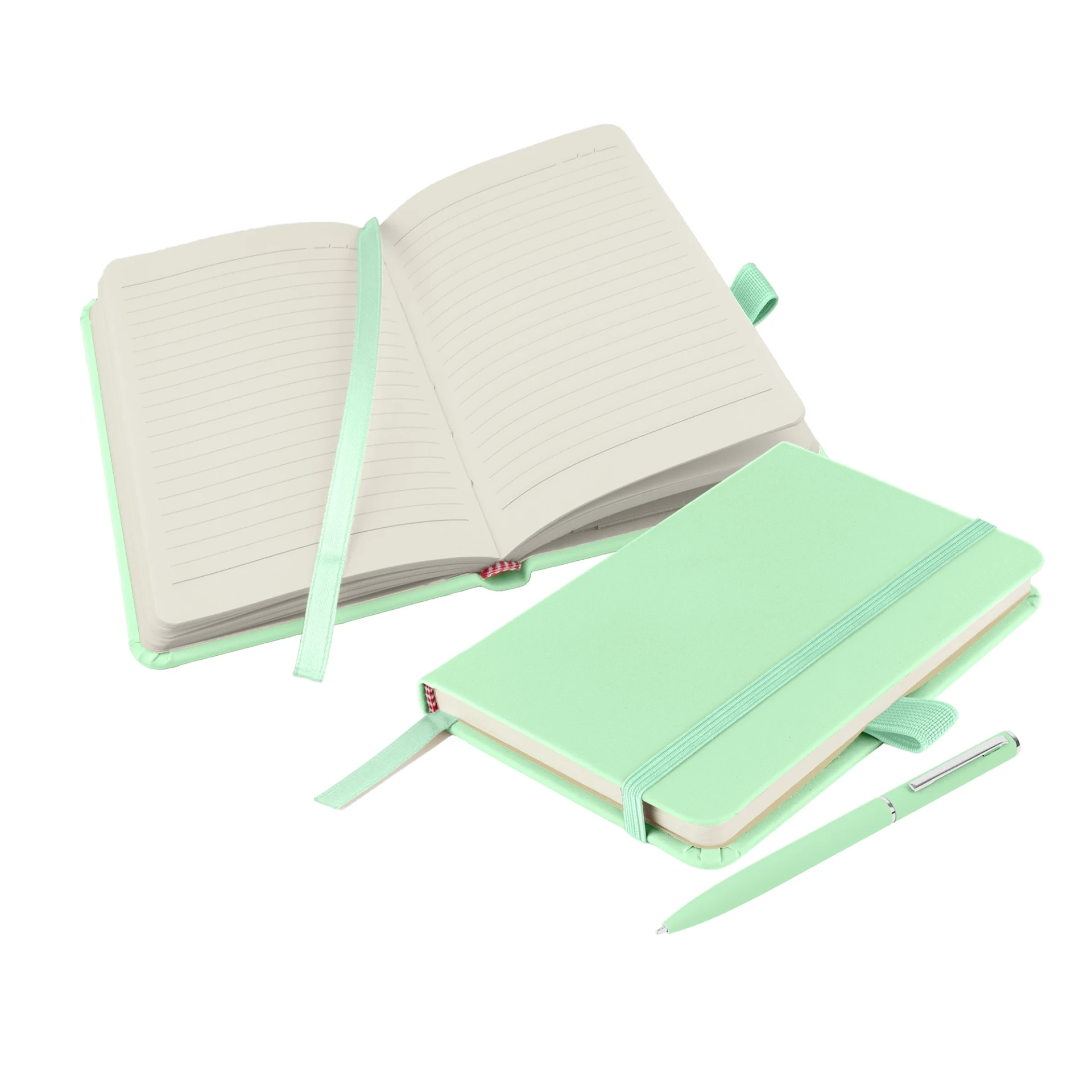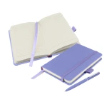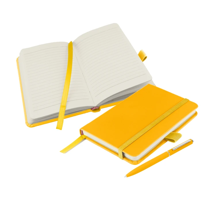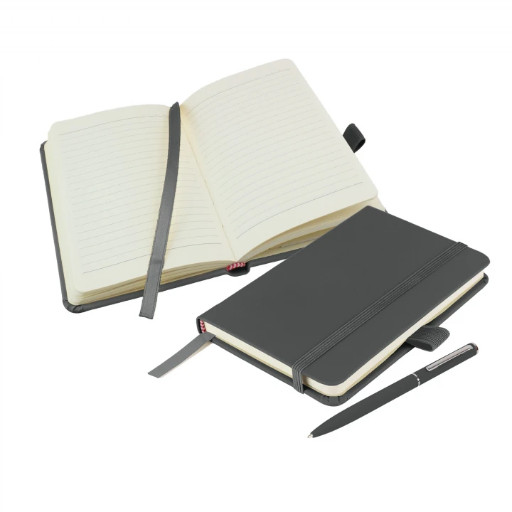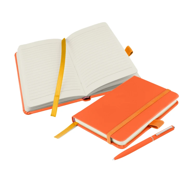 Deluxe eco-friendly A6 notebook offering high quality with its hardback, soft touch PU cover and matching Wright ballpen in 26 colours. Supplied with a colour matched ribbon, pen-loop and elastic closure. Contains 160 pages of Ivory lined paper, with date marks on each page and an inside back cover pocket, manufactured from FSC certified paper.