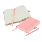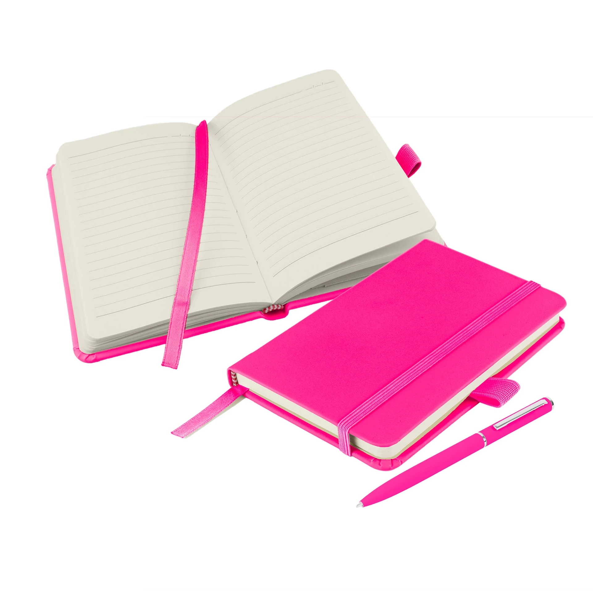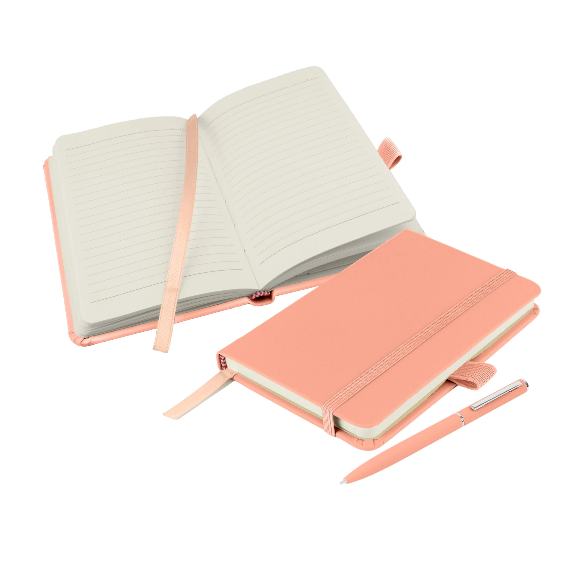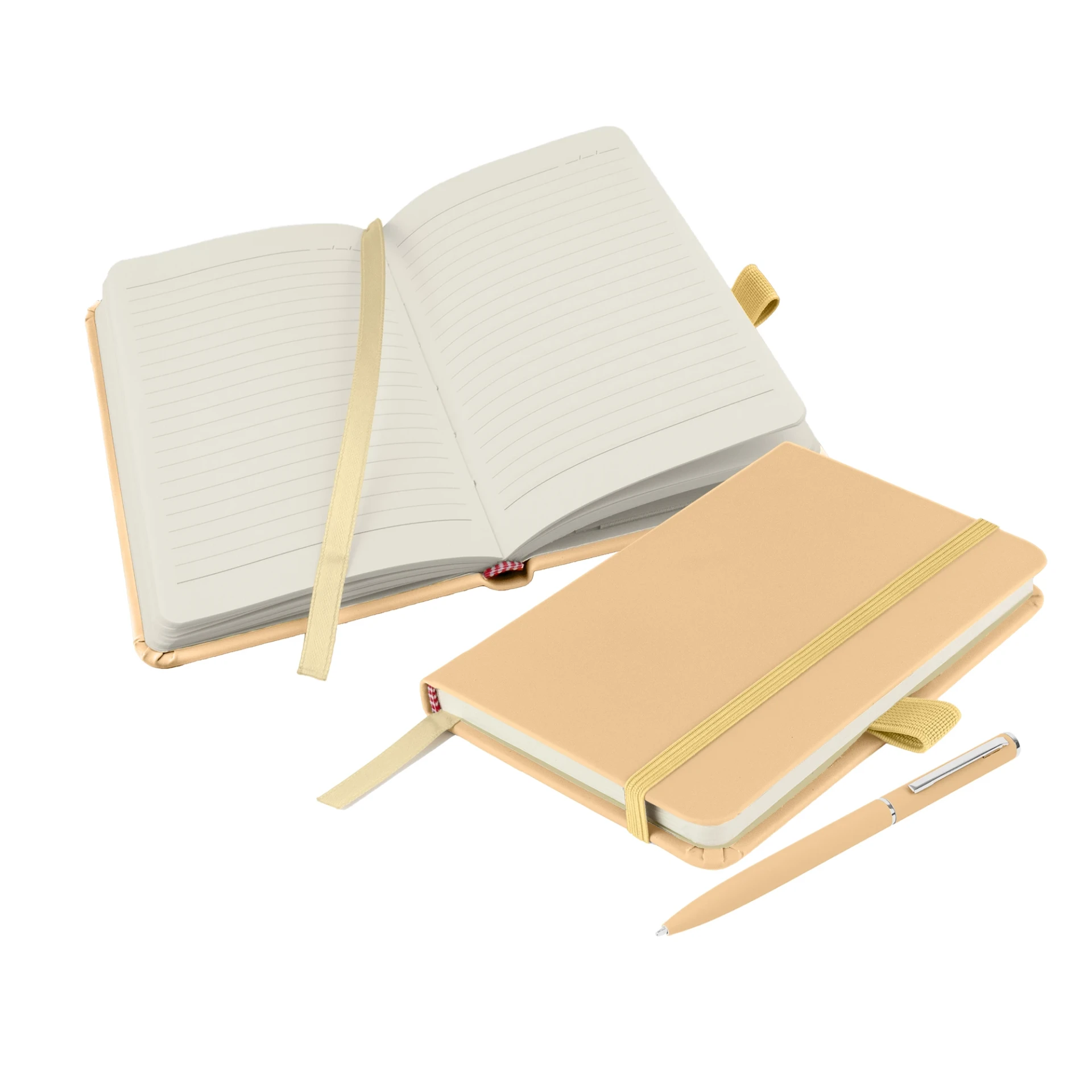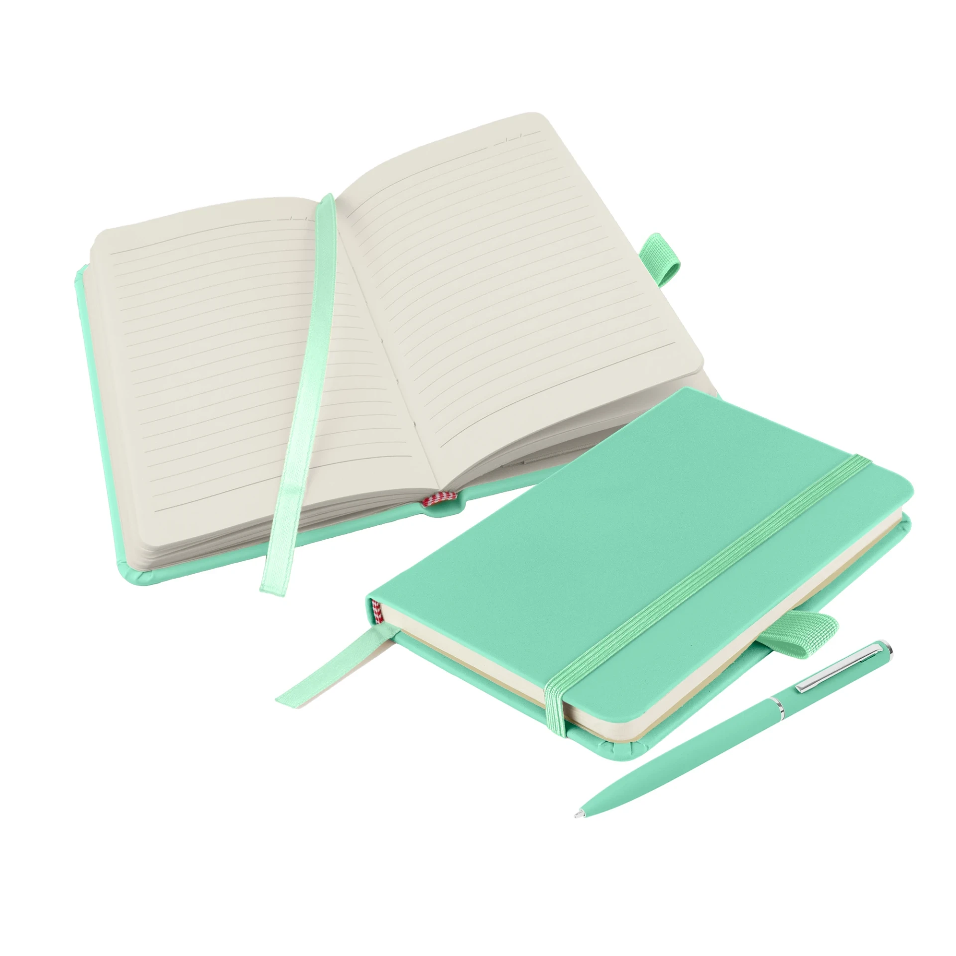Deluxe eco-friendly A6 notebook offering high quality with its hardback, soft touch PU cover and matching Wright ballpen in 26 colours. Supplied with a colour matched ribbon, pen-loop and elastic closure. Contains 160 pages of Ivory lined paper, with date marks on each page and an inside back cover pocket, manufactured from FSC certified paper.